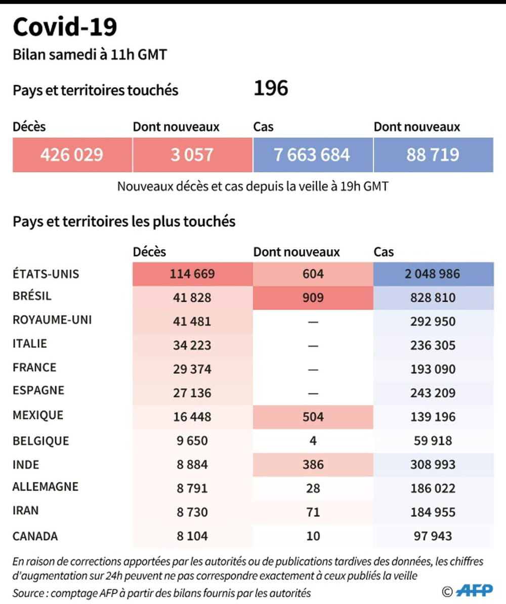Au total, le Covid-19 a fait plus de 426.000 morts, et infecté plus de 7,6 millions de personnes dans le monde, selon un bilan établi par l'AFP à partir de sources officielles.
