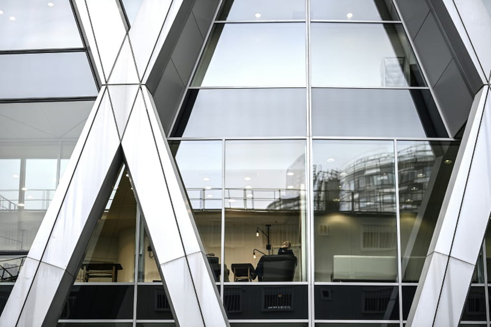Par la fenêtre du plateau plongé dans le noir, les immenses tours futuristes percent à peine le ciel de plomb en cette journée d'automne morose, près d'un an après l'apparition du coronavirus.