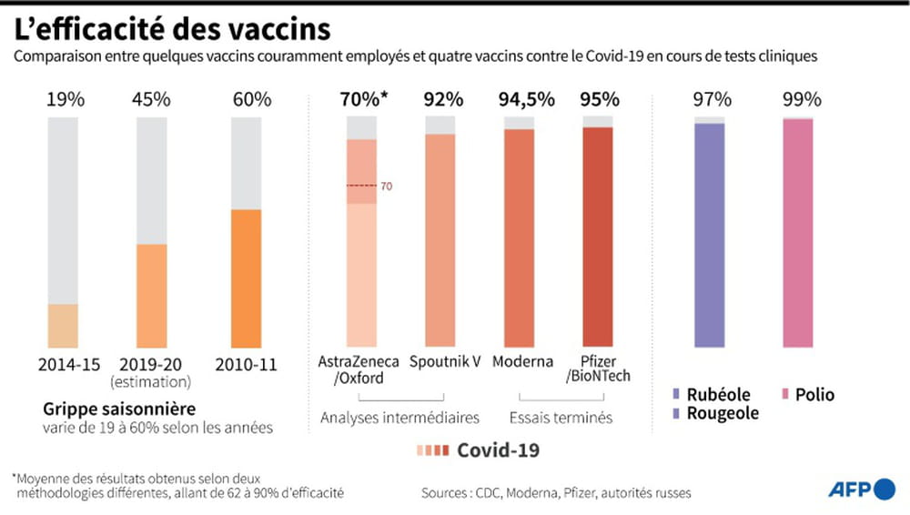 Pfizer/BioNTech se prévaut d'une efficacité de 95%: sur ses 170 malades, 8 venaient du groupe vacciné et 162 du groupe placebo. Idem ou presque pour Moderna, avec 94,5% d'efficacité (5 malades dans le groupe vacciné, 90 dans le groupe placebo). Le vaccin Spoutnik V russe, lui, affiche une efficacité de 91,4% sur ses 39 malades (et 95% sur un nombre de malades non précisé).