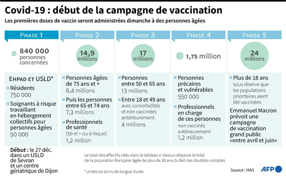 Le lancement symbolique de la campagne vaccinale française a lieu dimanche dans deux structures d'hébergement de personnes âgées, l'une située en Seine-Saint-Denis, département qui a payé un lourd tribut au Covid, l'autre en Bourgogne-Franche-Comté, une des régions où le taux d'incidence du virus est le plus élevé.
