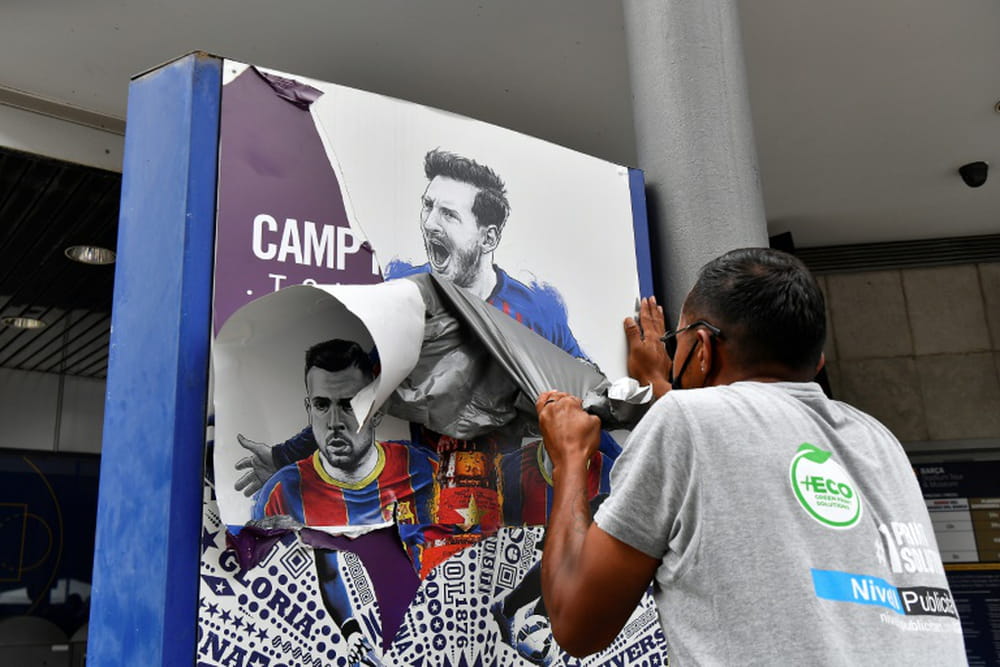 Alors qu'il s'apprêtait à décoller pour Paris, en début d'après-midi, le portrait géant de la "Pulga" était décroché des murs du Camp Nou, le stade où il a commencé à écrire sa légende.