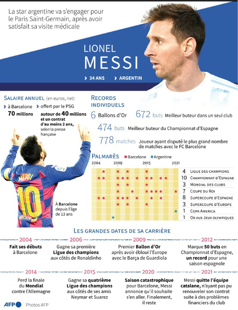 La presse française évoque pour Messi un salaire annuel net autour de 40 millions d'euros, et une conséquente prime à la signature.