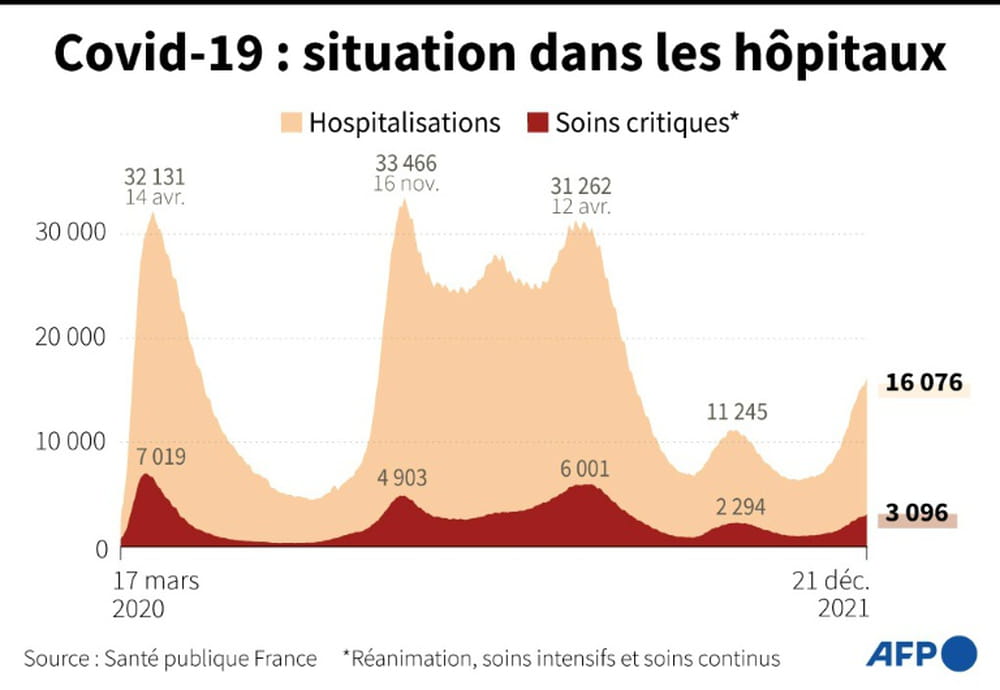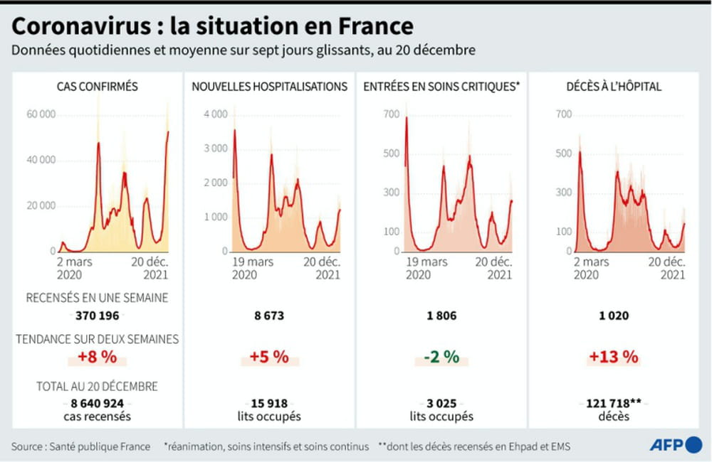 Le temps presse: le taux d'incidence du Covid-19 atteint "une nouvelle fois un record" en France, à 545 cas par semaine pour 100.000 habitants - près du double à Paris -, alors que le variant Omicron concerne désormais 20% des nouveaux cas, contre 10% le week-end dernier. La courbe de nouveaux cas quotidiens de contamination, qui tendait ces derniers jours à se stabiliser sur un plateau déjà élevé, est par ailleurs repartie à la hausse.