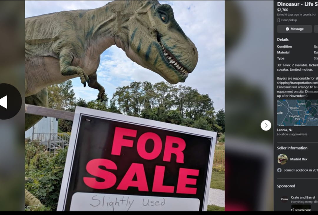 Après l'achat pour 6 millions d'euros dans les Yvelines d'un squelette d'Apatosaure de 22 mètres de long par un collectionneur, ce sont désormais des dinosaures grandeur nature issus d'un parc à thème qui sont proposés à l'achat. Ces animatroniques géants sont disponibles sur Facebook Marketplace et rencontrent un franc succès.