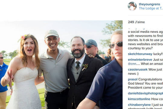 [Mis à jour le 15 ocotbre 2015 à 10h43] Les images, postées sur Instagram, sont en train de faire le tour du Web. Deux jeunes mariés, Brian et Stéphanie, ont eu la surprise de voir débarquer Barack Obama à leur mariage près de San Diego, le week-end dernier. Les deux tourtereaux avaient manifestement décidé de se dire "oui" au bon endroit : le Torrey Pines Golf Course de La Jolla. Autrement dit l'endroit où le président des Etats-Unis avait décidé de s'accorder quelques moments de détente en tapant la balle. Résultat : invité par la mariée, le chef de l'Etat américain a décidé de s'incruster au vin d'honneur, avec ses gardes du corps.