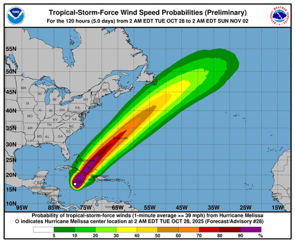Le Centre national des ouragans des États-Unis (NHC) annonce "des vents catastrophiques" pour l'ensemble de la Jamaïque et des rafales terribles sur l'ouest de l'île, selon les projections de trajectoire. L'île connaît déjà des conditions de tempête tropicale, indique le NHC, ajoutant que, sur la base des prévisions actuelles, Melissa devrait toucher terre "au cours des prochaines heures".
