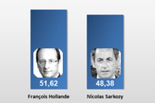 François Hollande va remplacer Nicolas Sarkozy à la tête de l'Etat. Le candidat socialiste a remporté le second tour du scrutin le 6 mai 2012 avec 51,62 % des voix, battant ainsi Nicolas Sarkozy qui n'a réussi à réunir que 48,38 % des suffrages. François Hollande devient donc le septième président de la Ve République française. Mais l'écart entre les deux finalistes n'est pas très grand : 3,24 points séparent seulement les deux concurrents. Très loin des sondages qui depuis des mois faisaient état d'un écart bien supérieur. Les premières estimations diffusées à 20 heures au soir du premier tour donnaient un écart un beaucoup plus important, avec François Hollande à 55 % face à un président sortant à 45 %. Au second tour aussi les premiers chiffres étaient plus larges: 52% pour le candidat socialiste contre 48 % pour son rival UMP. L'écart s'est resserré au fil de la nuit. Les résultats de la présidentielle, communiqués par le ministère de l'Intérieur, étant les vrais chiffres pour cette présidentielle 2012, une fois tous les bulletins dépouillés.