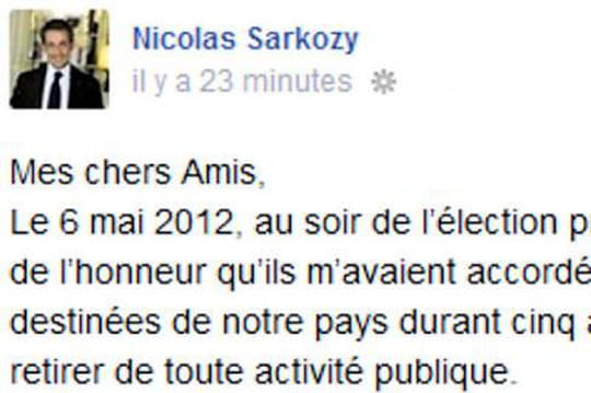 Enfin, ça y est, Nicolas Sarkozy est officiellement de retour en politique. L'ancien chef de l'Etat a publié ce vendredi 19 septembre, dans l'après-midi, un message sur Facebook pour s'expliquer. Le texte ne donne en fin de compte que peu d'informations sur ce qu'il compte faire pour l'UMP et pour la France, mais l'acte politique est là. Nicolas Sarkozy est on ne peut plus clair : il faut désormais compter avec lui dans le débat public. Un message à destination du pouvoir en place, mais aussi et surtout à l'UMP, à l'ensemble de la droite et du centre. Voici ce qu'il faut retenir :