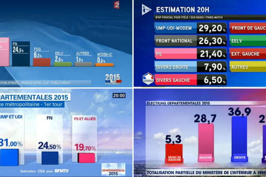 Plus que quelques minutes avant le verdict. Depuis ce matin 8 heures, les bureaux de vote sont ouverts dans tout le pays pour les élections départementales. A 20 heures, ils auront tous fermé leurs portes, après une première vague à 18 heures et une deuxième à 19 heures. Les résultats du 2e tour des élections départementales sont sur le point d'être officiellement publiés. Dans un premier temps, seules des estimations et des projections devraient être disponibles. Celles-ci sont calculées par trois instituts de sondages travaillant chacun pour des médias différents : CSA pour BFMTV, Ifop pour iTélé, Paris Match et Sud radio et enfin Ipsos pour France télévisions et Radio France. Ces estimations seront vite relayées par des résultats partiels puis définitifs venus du ministère de l'Intérieur, les dépouillements et la validation des scores devant être normalement plus rapide qu'au premier tour.