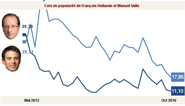 Six mois. Il reste maintenant six mois à François Hollande pour tenter de redonner du souffle à son quinquennat et tenter de terminer en beauté ce qui a plutôt ressemblé jusqu'ici à un chemin de croix. Lors d'une rentrée présentée comme décisive, le discours de Wagram devait lancer quelques perspectives en vue de la campagne du président sortant. Mais la poisse (et peut-être aussi une forme de maladresse) a continué à lui coller à la peau. Avant même l'interview à l'Obs et les confidences hasardeuses du chef de l'Etat révélées dans un livre, François Hollande s'est trouvé en première ligne dans le dossier Alstom, avec une réactivité et des solutions qui n'ont pas fait l'unanimité. La "trahison" d'Emmanuel Macron, qui l'a qualifié de "sociopathe", a aussi plombé le moral du locataire de l'Elysée qui perd encore quelques dixièmes ce trimestre. Manuel Valls, qui pourrait être un recours pour l'élection présidentielle en cas d'abandon de François Hollande, est plus lourdement sanctionné encore. Il perd 2,3 points, et passe sous les 20 % de satisfaits.
