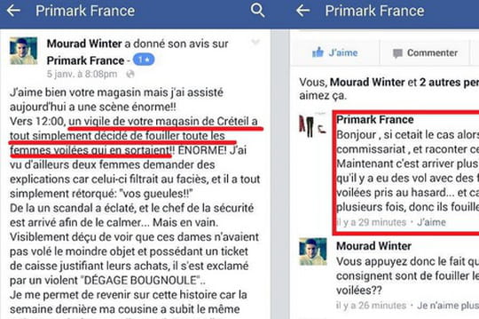 Se méfie-t-ton des femmes voilées chez Primark ? Le Collectif contre l’islamophobie en France (CCIF) accuse l’enseigne irlandaise de prêt-à-porter, arrivée récemment en France, de discriminer ses clientes portant le voile. Comme le révèle notamment Rue 89, le collectif met en lumière deux affaires troubles. La première fait état d’un message Facebook d’un client ayant remarqué, en janvier dernier, que toutes les femmes voilées étaient fouillées à la sortie du magasin de Créteil (Val-de-Marne). Ce à quoi Primark France avait répondu ceci (fautes de français comprises) : "Bonjour, si cetait [sic] le cas alors allez au commissariat, et raconter cela Maintenant c’est arriver plusieurs fois qu’il y a eu des vol avec des femmes voilées pris au hasard… et ca repete plusieurs fois, donc ils fouillent." Primark s’est défendu en assurant que le compte Facebook ayant répondu au client n’était pas officiel et qu’il a été fermé depuis. Et dément les accusations dont il fait l’objet. Contacté par Rue 89, le responsable chargé de la sécurité dans le magasin de Créteil ni n'infirme ni ne confirme avoir reçu des directives visant à cibler les femmes voilées. Le service de presse de la Primark a refusé de communiquer à ce sujet.