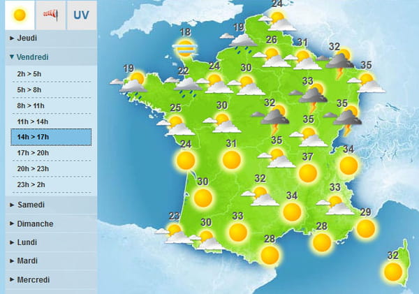 Selon Météo France, les températures vont peu à peu baisser dans les prochains jours. Dans le grand quart nord-ouest, les maximales ne devraient pas dépasser les 26°C. Mais il fera encore très chaud en Ile-de-France, dans la région Centre, et surtout dans l'est de la France vendredi. Samedi, pour le premier jour du week-end, des orages devraient éclater sur une large partie de la France, sur une bande diagonale qui se dessinera de la région Midi-Pyrénées jusqu'en Alsace. Dimanche, le mercure ne dépassera pas les 30°C, avec des maximales moyennes autour de 27°C. En début de semaine prochaine, la chaleur devrait s'intensifier à nouveau sur l'ensemble du territoire, seules la pointe bretonne et les côtes de la Manche seront épargnées par les grandes chaleurs.