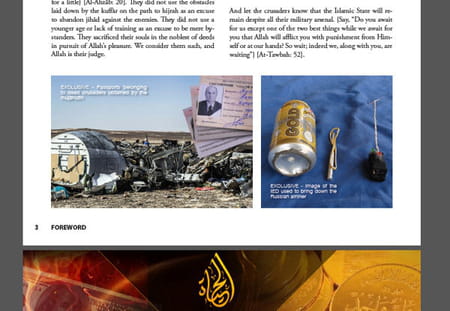 Dabiq fait aussi référence à la Russie, elle aussi impliquée dans des frappes contre les terroristes en Syrie et visée par l'EI via l'attentat contre un avion de ligne russe dans le Sinaï égyptien le 31 octobre (224 morts). Après avoir revendiqué l'attaque de l'appareil il y a quelques jours, Daesh explique dans son magazine comment a été dissimulée la bombe qui a fait sauter l'appareil : en utilisant une simple canette selon l'organisation. L'image de ce prétendu "IED" (pour "Improvised Explosive Device" ou "engin explosif improvisé") est même reproduite dans les pages du magazine.