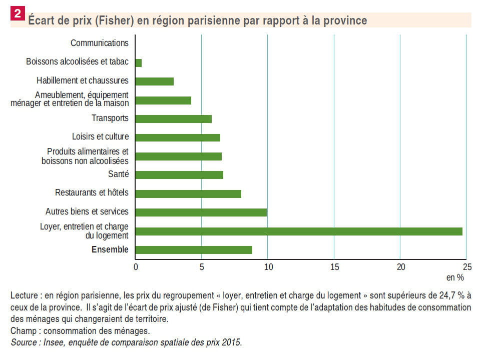 L'Insee précise toutefois que les salaires connaissent aussi des écarts de prix sur le territoire français : le salaire horaire net moyen d'un ouvrier ou d'un employé serait ainsi 8 à 10 % plus élevé en Ile-de-France que dans les autres régions. Concernant la Corse, les prix y sont 3,6 % plus élevé qu'en province.
