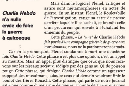 Dans cet éditorial, la colère et l'émotion de Riss sont manifestes. "Cette phrase, 'la une de Charlie Hebdo fait partie d'une campagne générale de guerre aux musulmans', nous ne l'oublierons jamais", annonce-t-il, avant de poursuivre : "En la prononçant, Plenel condamne à mort une deuxième fois 'Charlie Hebdo'. Cette phrase n'est plus une opinion, c'est un appel au meurtre". L'éditorial de l'un des rescapés de l'attaque des frères Kouachi, le 7 janvier 2015, se poursuit en invoquant l'attachement à la laïcité de Charlie Hebdo, un hebdomadaire qui n'a "envie de faire la guerre à quiconque". Riss déplore l'attitude d'Edwy Plenel, "le Rouletabille de l'investigation" comme il le surnomme, et l'accuse d'avoir substitué son rôle de journaliste à celui de procureur, avant de conclure son texte de façon glaçante. "Si demain on nous liquide tous, si demain nous ne sommes plus là, espérons qu'il subsistera quelques courageux qui demanderont justice contre ceux qui nous auront frappés, mais aussi contre les esprits qui les auront armés", écrit-il.