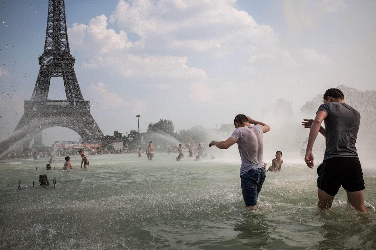 Ici le 26 juillet, à Paris. Des passants se baignent dans les fontaines du Trocadéro pendant la canicule, en face de la Tour Eiffel.