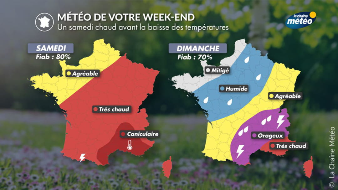Samedi, quelques nuages pourraient se former sur les côtes de la Manche, mais ailleurs le soleil sera bien présent. Dans la moitié nord, il fera bon, autour de 25°C. Un temps plutôt appréciable pour les premiers départs en vacances. Dans le centre, le mercure monte, rejoignant les 30°C. Le soleil de plomb persiste dans le sud-est. C'est dimanche qu'un réel changement sera constaté. Une dépression venue d'Islande va toucher une majeure partie du territoire, comme l'annonce La Chaine Météo.