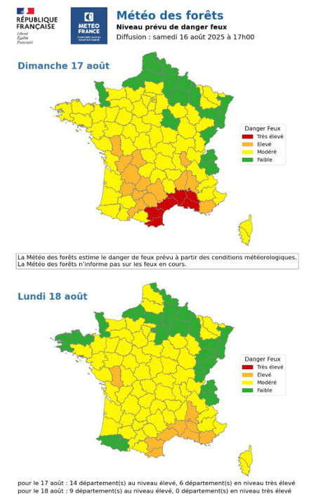 Attention aux feux de forêts. Le niveau de risque est à son plus haut : six départements sont en vigilance rouge ce dimanche, signifiant un danger "très élevé" de départs de feux. Sont concernés les Pyrénées-Orientales, l'Aude, l'Hérault, le Gard, les Bouches-du-Rhône et le Vaucluse. Météo France met en effet en garde contre les fortes chaleurs caniculaires et "l'état de sécheresse de la végétation", qui favorisent les incendies. Dans l'Aude, le risque est même catégorisé comme "extrême", une première depuis 2016, selon la préfecture et les pompiers. Quelque 1 200 pompiers sont "en alerte" dans le département tout le week-end.