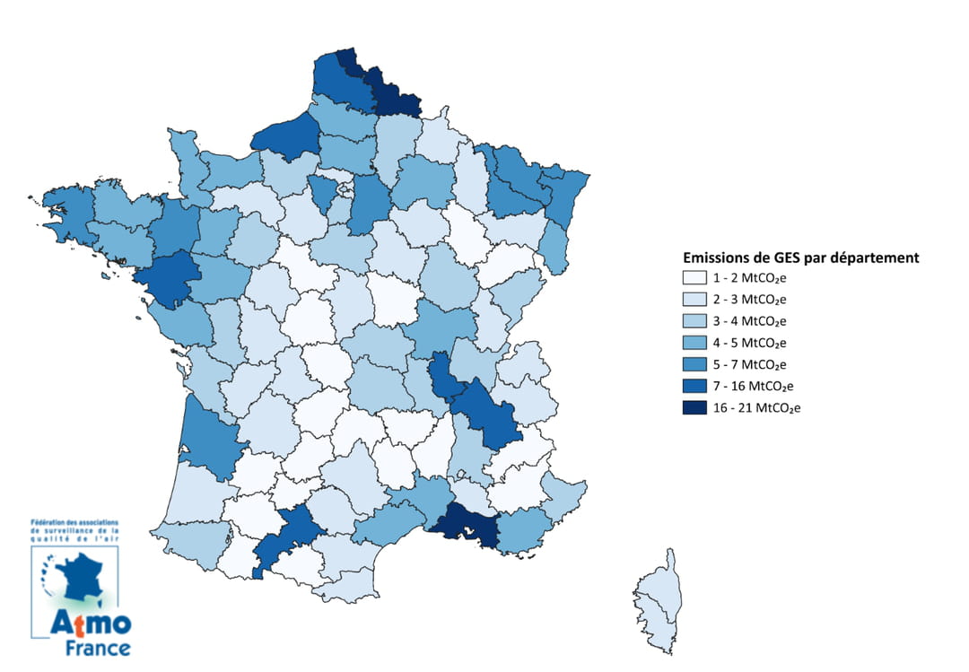 C'est d'ailleurs dans ces dernières que se situent les départements émettant le plus de GES : les Bouches-du-Rhône et le Nord qui émettent entre 16 et 21 MtCO2e (millions de tonnes équivalent CO2). Ensuite, entre 7 et 16 MtCO2e, se placent le Pas-de-Calais, la Haute-Garonne, l'Isère, le Rhône, mais aussi la Loire-Atlantique et la Seine-Maritime. La carte ci-dessous donne la tranche d'émissions de GES par département.