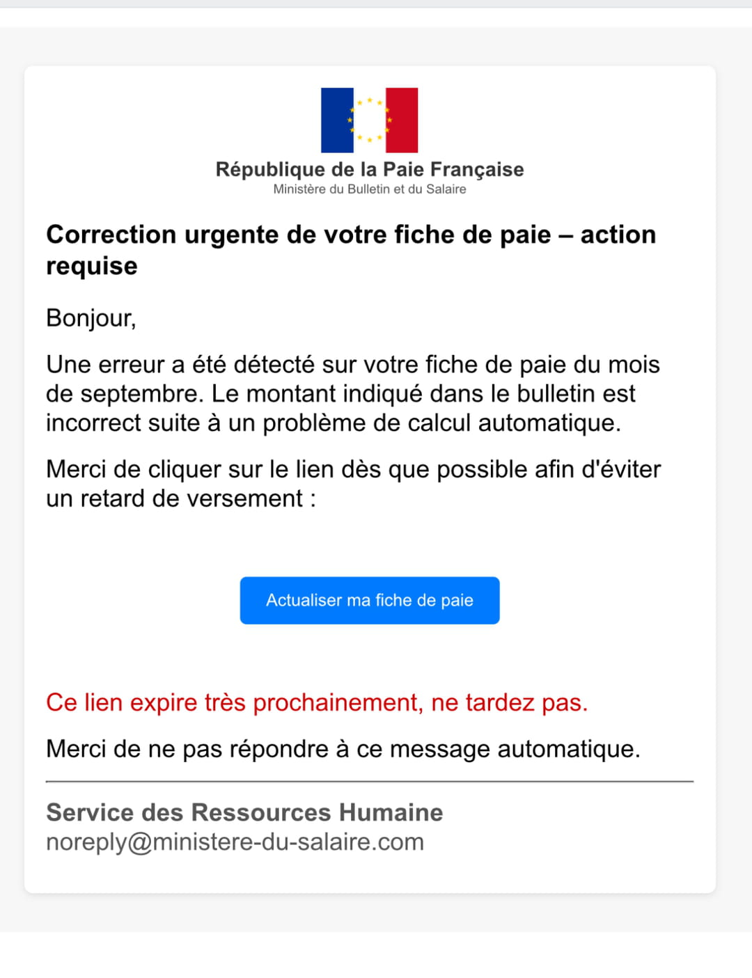 Notre lectrice nous a fourni la capture d'écran de ce mail, ce qui permet de décrypter les informations présentes. On y trouve en haut un logo représentant le drapeau français surmonté des étoiles de l'Union européenne qui surmonte la République de la paie française (sic). "Bonjour, une erreur a été détecté (sic) sur votre fiche de paie du mois de septembre. Le montant indiqué dans le bulletin est incorrect suite à un problème de calcul automatique"; Merci de cliquer sur le lien dès que possible afin d'éviter un retard de versement". Puis un bouton bleu "Actualiser ma fiche de paie". On trouve encore des injonctions urgentes en dessous "Ce lien expire très prochainement, ne tardez pas".
