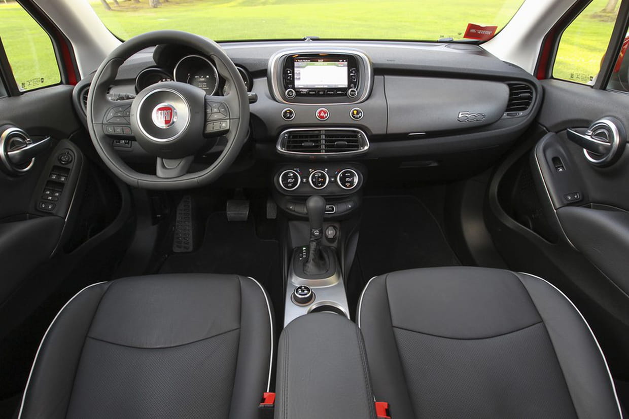 A l’intérieur, la Fiat 500X se veut accueillante et bénéficie d’un design inédit pour la planche de bord, même si certains éléments s’inspirent des codes de la 500. Le tableau de bord se compose de deux compteurs analogiques qui encadrent l’écran TFT 3,5 pouces de l’ordinateur de bord tandis que la partie multimédia se gère à partir de l’écran 5 ou 6,5 pouces du système Uconnect situé en haut de la console centrale. Les espaces de rangement sont nombreux et le coffre de 350 litres offre un volume de chargement plat de 1 000 litres lorsque les sièges arrière sont rabattus.