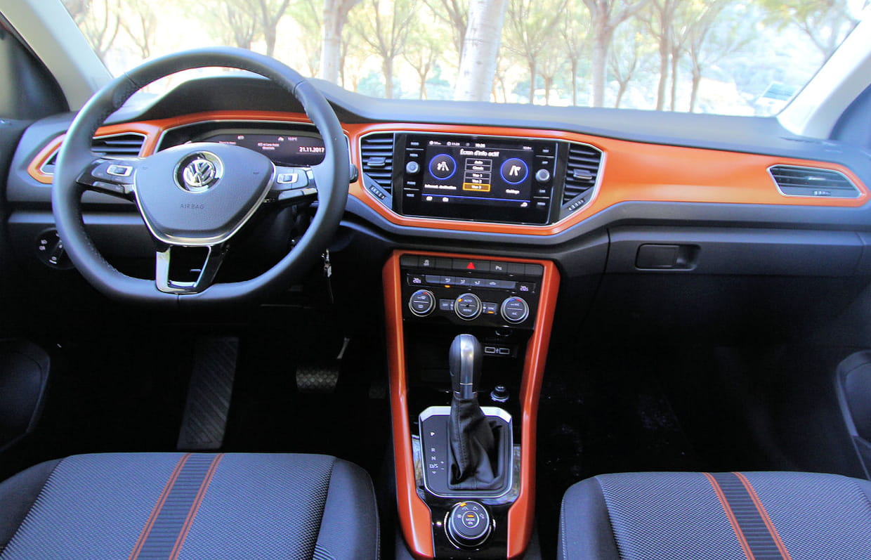 On apprécie les rappels de couleur dans l'habitacle avec un insert coloré qui court tout le long de la planche de bord, à l'image de ce qui a déjà été vu sur la nouvelle Polo et des rappels sur la sellerie et le contour de la console centrale.