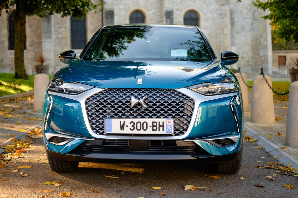 Si notre modèle d'essai et celui mis en avant par DS arborent un gris clair du plus bel effet, le DS3 Crossback E-Tense va bien sûr être proposé avec les coloris de la version thermique. Ce Bleu Millenium est lui aussi très joli. On remarque à l'avant la présence des feux Matrix LED, capables d'éteindre certaines de leurs parties la nuit afin de ne pas éblouir les conducteurs qui arrivent en face de nous lorsqu'on circule en feux de route.
