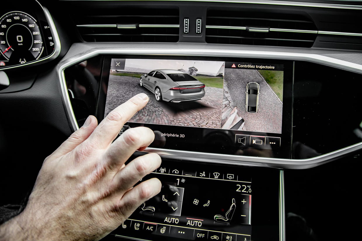 Le système d'aide à la conduite comporte évidemment des caméras pour gérer les manoeuvres mais aussi un nouveau scan du véhicule qui permet une vision d'ensemble des abords de l'A7 (ici visible sur la partie droite de l'écran). 39 systèmes d'aide à la conduite sont présents dans cette A7 Sportback !