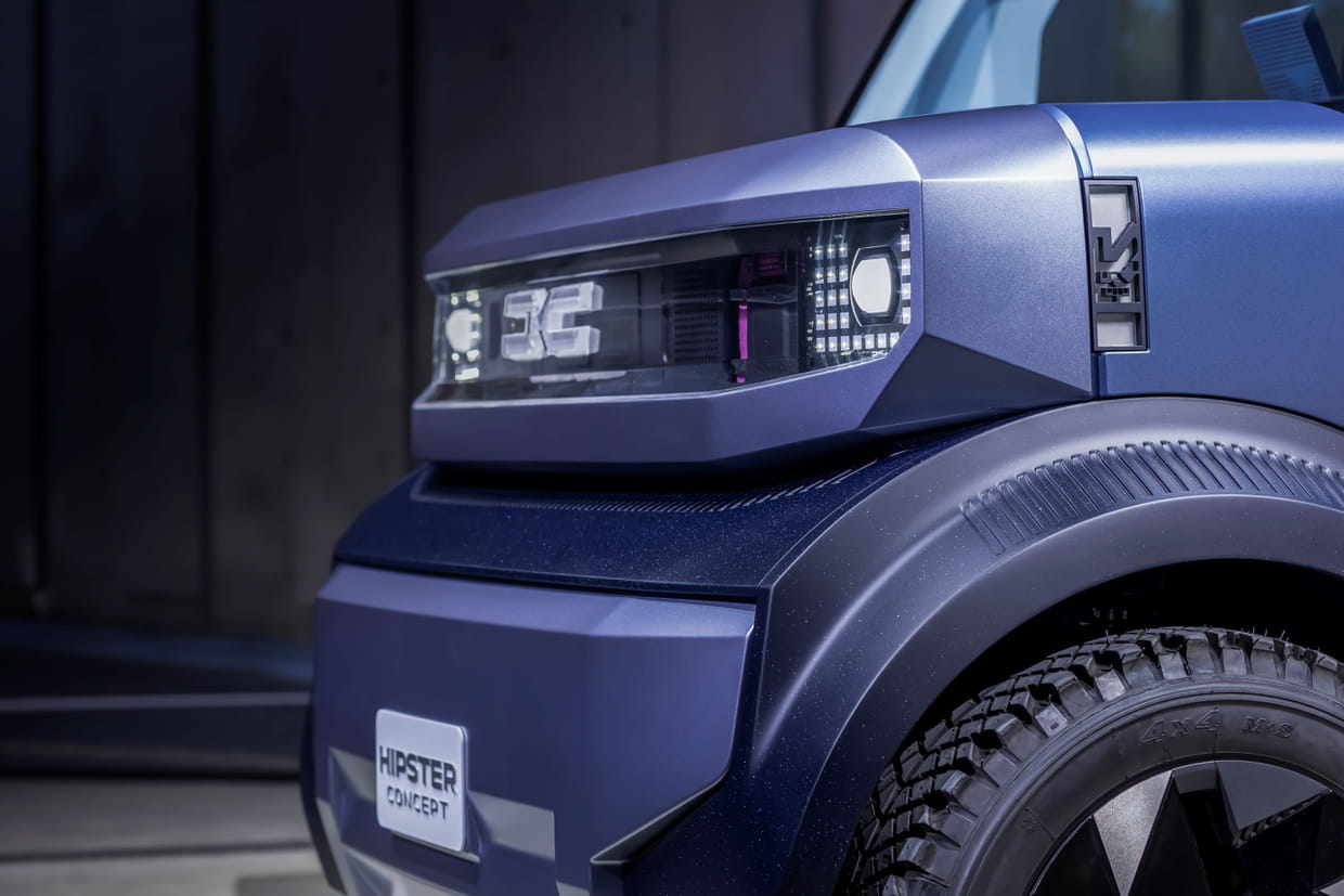 Le capot du concept-car est particulièrement plat alors que la face avant est toute verticale, ce qui participe à la silhouette très cubique du Hipster. Les projecteurs, qui font penser à deux yeux, sont situés aux deux extrémités de la calandre.