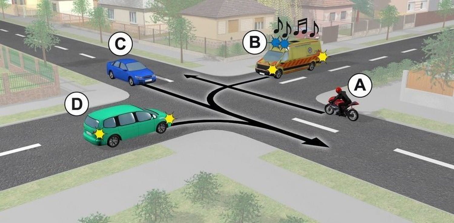 Cette situation est ainsi particulièrement intéressante puisqu'elle présente une situation courante en apparence avec plusieurs véhicules se présentant à une intersection. Imaginez-vous arriver à une intersection à bord de votre voiture bleue. En face, une moto s'apprête à passer tout droit sur la voie opposée. Sur votre droite, une voiture verte va tourner à droite. Et soudain, surgissant à votre gauche, un véhicule de secours toutes sirènes hurlantes arrive. Dans ce scénario digne d'un film d'action, qui a la priorité ?