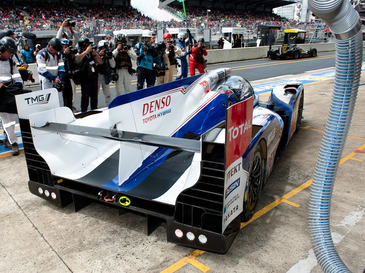 La Toyota est sortie du box et elle peut reprendre la course. La réparation a été ultra rapide (quelques minutes) et la voiture va finalement conserver sa quatrième place à l'arrivée. Le démarrage des Toyota hybrides est particulier : les moteurs électriques lancent la voiture sur les premiers mètres.