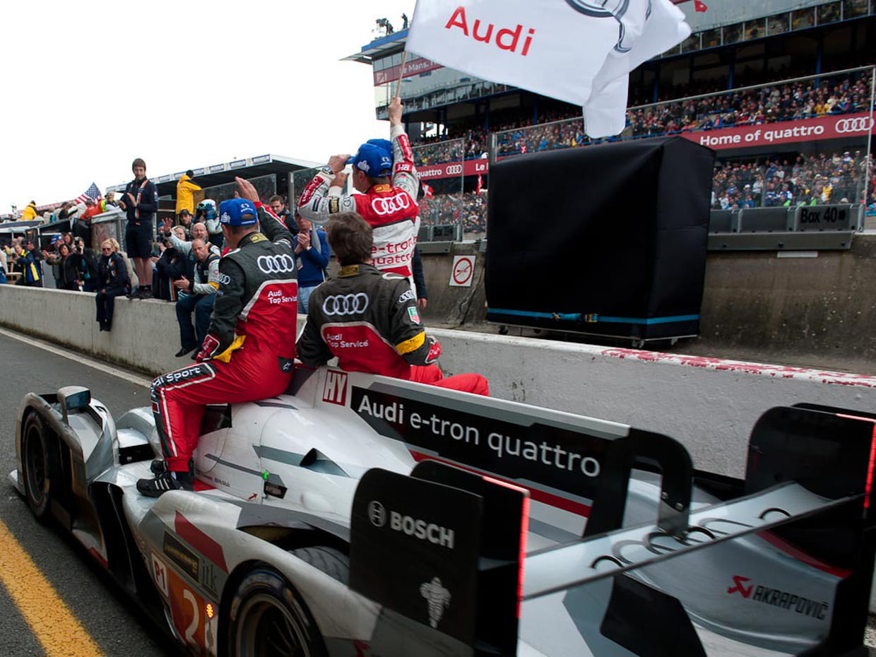 Traditionnellement, le vainqueur peut remonter la voie des stands pour regagner le podium. Les box Audi sont à l'extrémité des stands, à près de 400 m du podium. Autant y aller en voiture !
