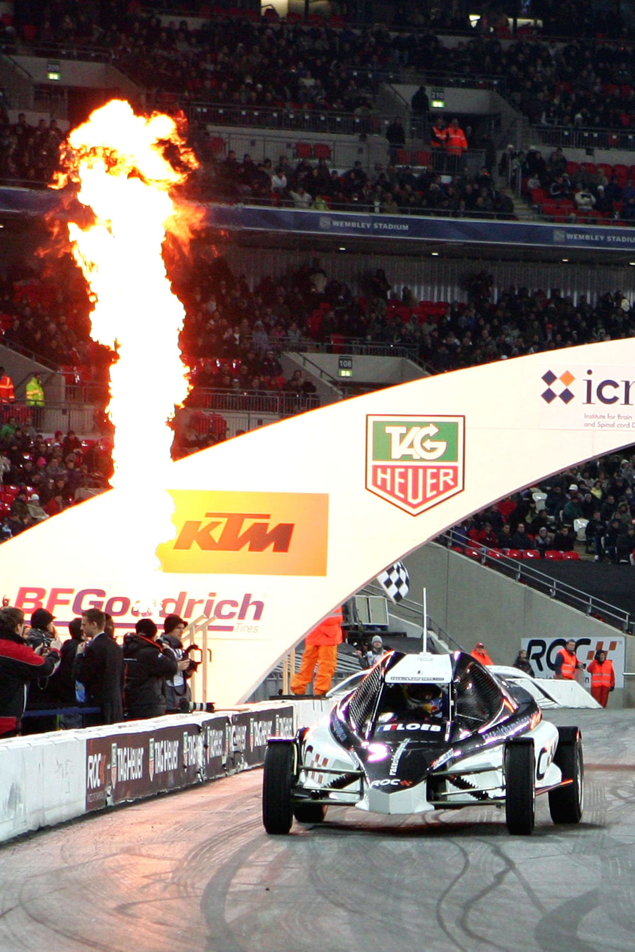 Loeb s'imposera trois fois en tant que Champion des Champions dont ici en 2008 face à David Coulthard à Wembley au volant d'un prototype unique, le ROC CAR qui abat le 0 à 100 km/h en 2,9 secondes