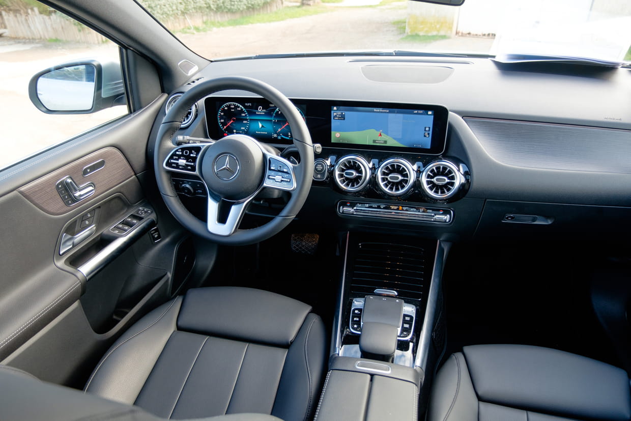 Bienvenue à bord du nouveau Mercedes Classe B ! Les connaisseurs de la dernière Mercedes Classe A ne seront pas dépaysés : l'intérieur du Classe B reprend le style de l'habitacle de cette dernière. On retrouve ainsi à partir de la finition Progressive (celle de notre premier modèle d'essai) les deux écrans de 10,25 pouces, intégrés dans une seule et unique grande tablette. L'un affiche le combiné d'instrumentation, l'autre le système d'info-divertissement et la navigation. L'option est facturée 550 euros.
