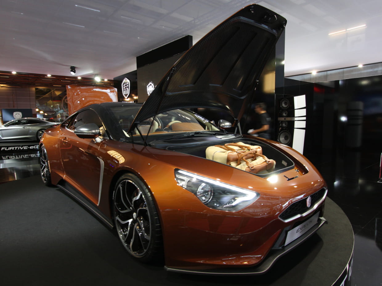 Voici la nouvelle Exagon Furtive e-GT. Présent au Mondial de l'Auto en 2010, le constructeur français Exagon dévoile la version définitive de sa Furtive e-GT. La supercar se dote de deux blocs électriques en position centrale arrière et développent à eux deux 296 kW, soit 402 ch et 516 Nm de couple. Ainsi équipée, l'Exagon Furtive e-GT peut alors avaler le 0 à 100 km/h en seulement 3,5 secondes et 250 km/h en vitesse de pointe.