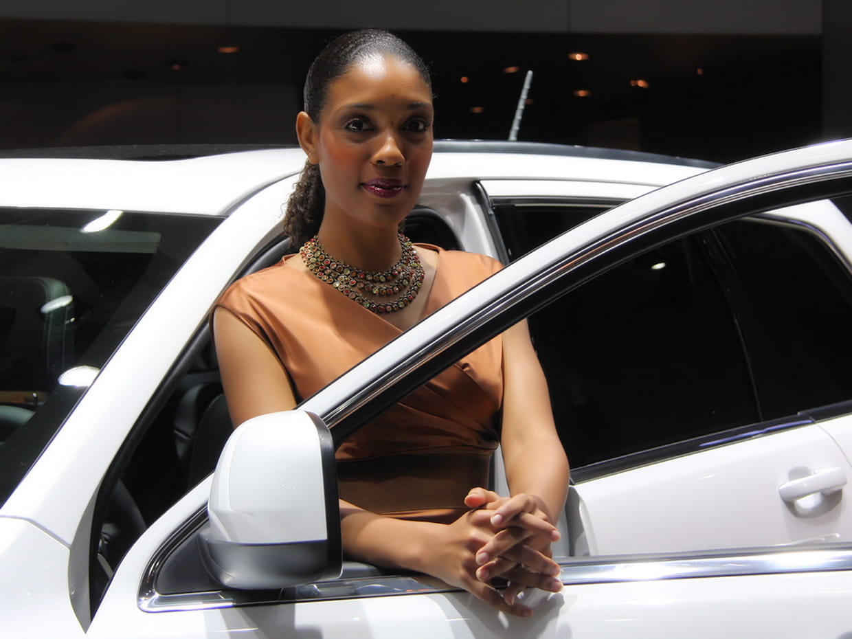 Depuis le rachat, le constructeur Jeep souhaite varier son image et prouve qu'il peut aussi produire des véhicules haut de gamme. Il a donc choisi pour l'occasion une hôtesse chic et raffinée.