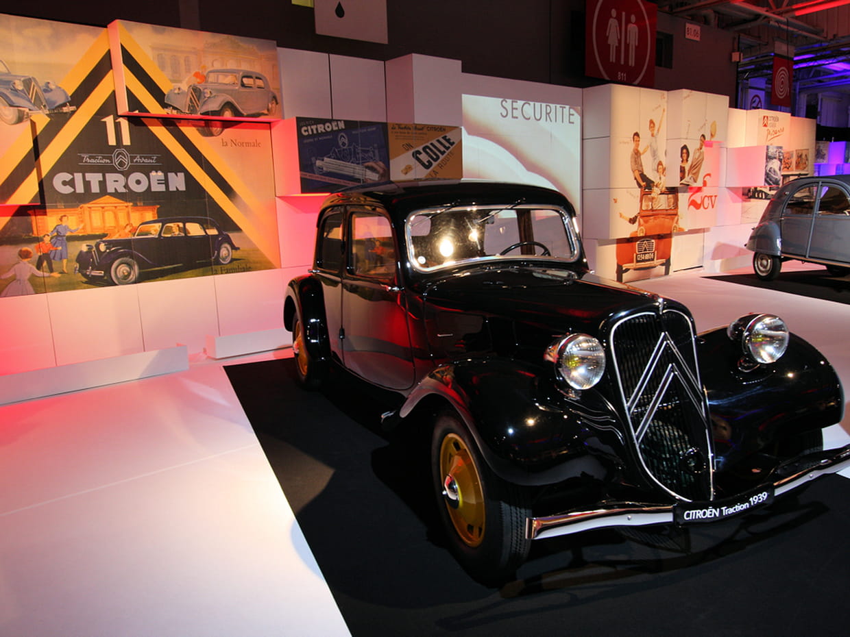 Cirtoën 11 BL Traction Avant 1939. Pour le lancement de sa nouvelle Citroën Traction Avant en 1934, André Citroën présente les modèles 7, 11 et 22 (seules les deux premiers seront commercialisés). Grâce à ce modèle, la marque aux chevrons possède alors une avance technologique de près de 30 ans sur la concurrence. En précipitant un exemplaire de la Traction du haut d'une falaise en 1934, André Citroën démontre la résistance de sa voiture dotée d'une carrosserie monocoque. Les supports publicitaires vantent principalement les qualités de routière.
