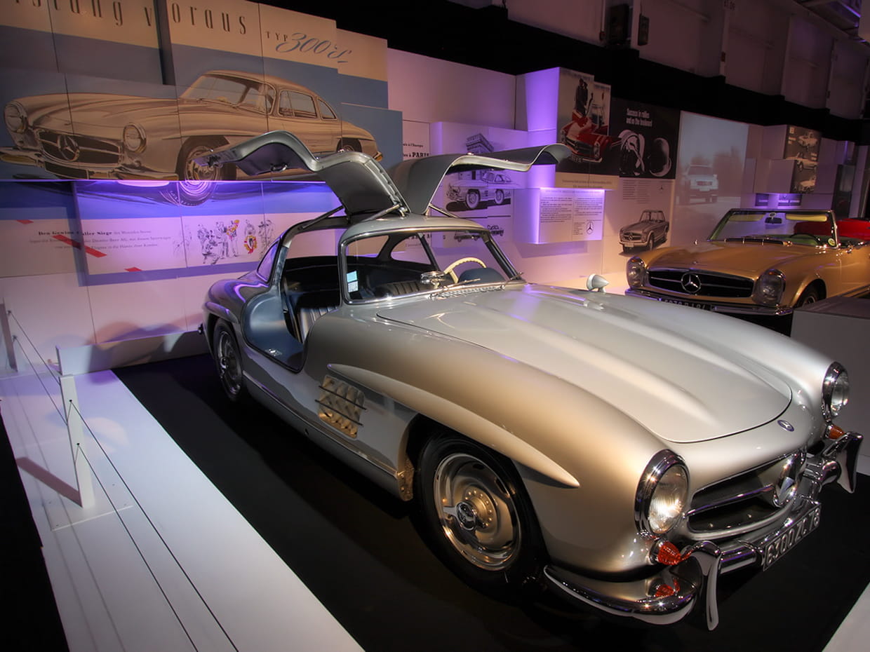 Mercdes-Benz 300 SL1957. En septembre 1953, l'importateur d'automobiles Max Hoffmann réussit à convaincre la direction de Daimler-Benz de produire une version de série de la Mercedes-Benz 300 SL : après les légendaires succès en course de la saison 1952. Avec ses gênes issus du sport automobile, la version de série et ses portes "papillon" deviendront un véritable mythe.