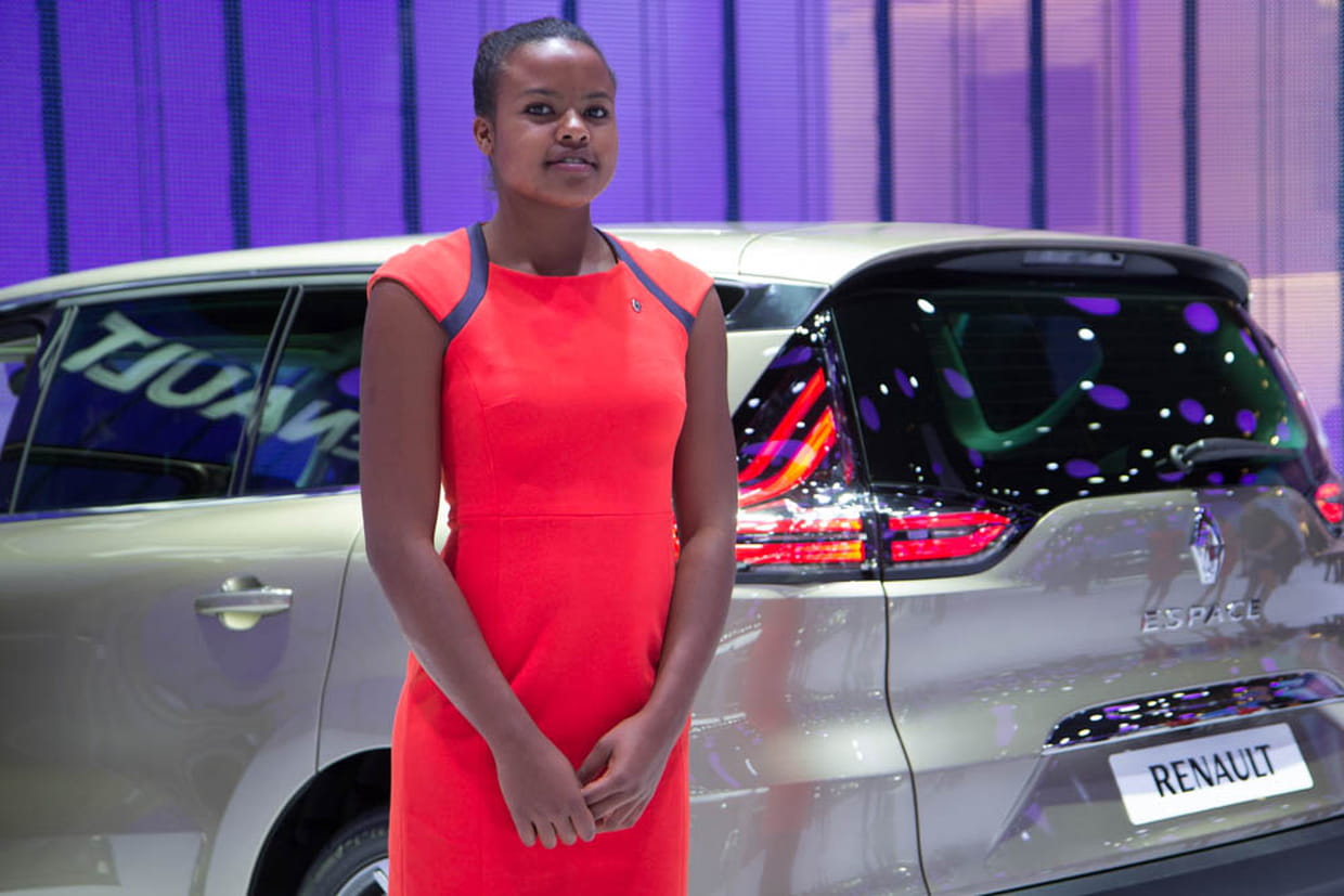 Devant le nouvel Espace 5 de Renault, cette hôtesse porte une jolie robe rosée.
