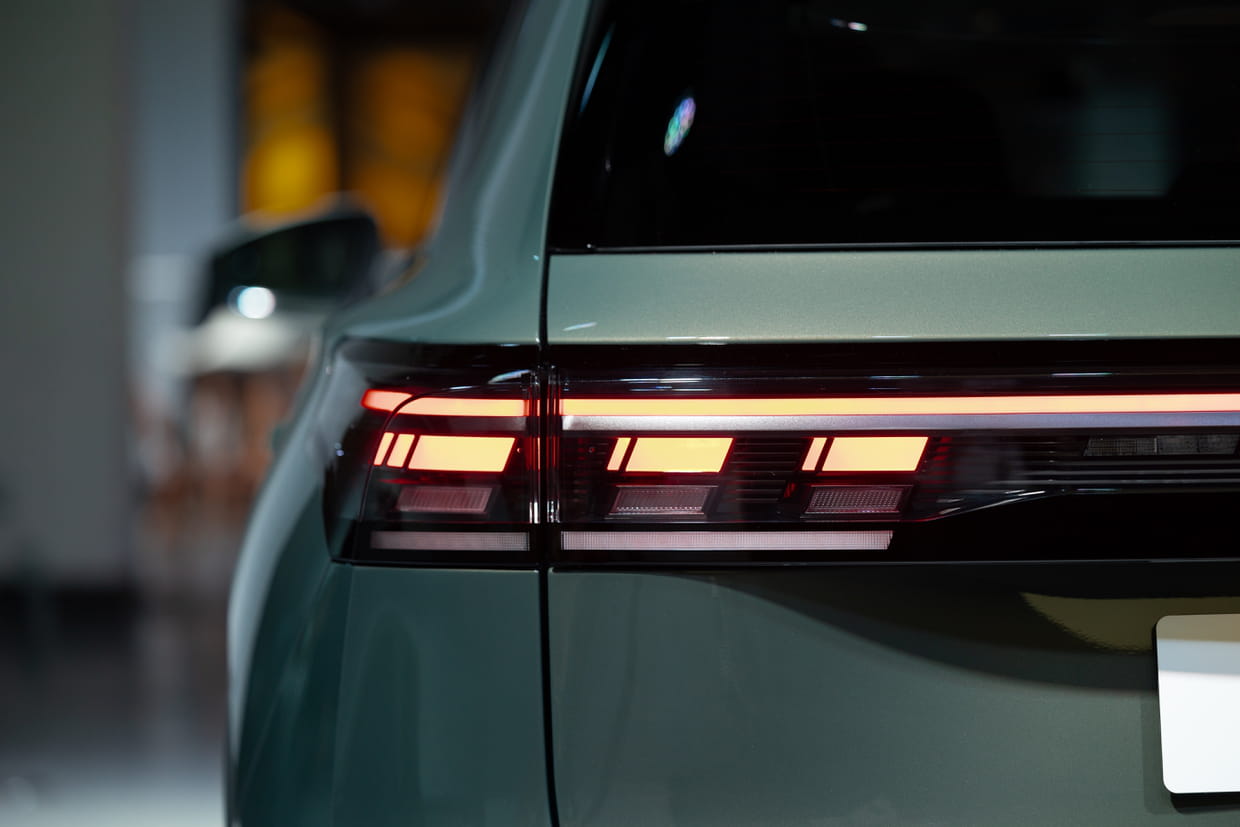 Comme à l'avant, en fonction de la gamme ou en option, le nouveau Tiguan bénéficie du jonc lumineux qui relie les feux arrière. Les phares, très rectangulaires, se composent de trois petites bandes horizontales parallèles au bandeau noir ou lumineux.