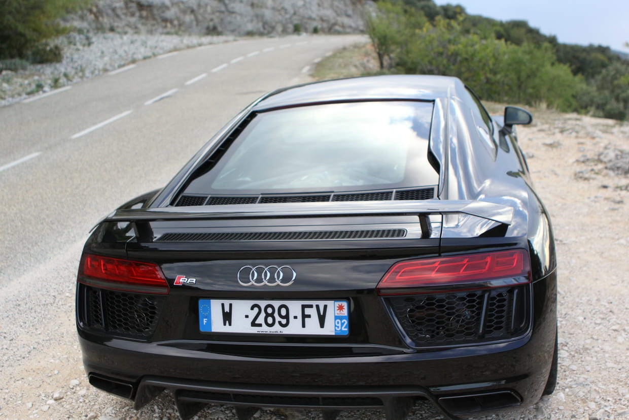 A l’arrière, on retrouve un large diffuseur. Le travail des ingénieurs de la marque d’Ingolstadt a notamment consisté à réduire le poids de la R8. Le châssis est 40% plus rigide avec l’emploi d’aluminium et 15% plus léger.