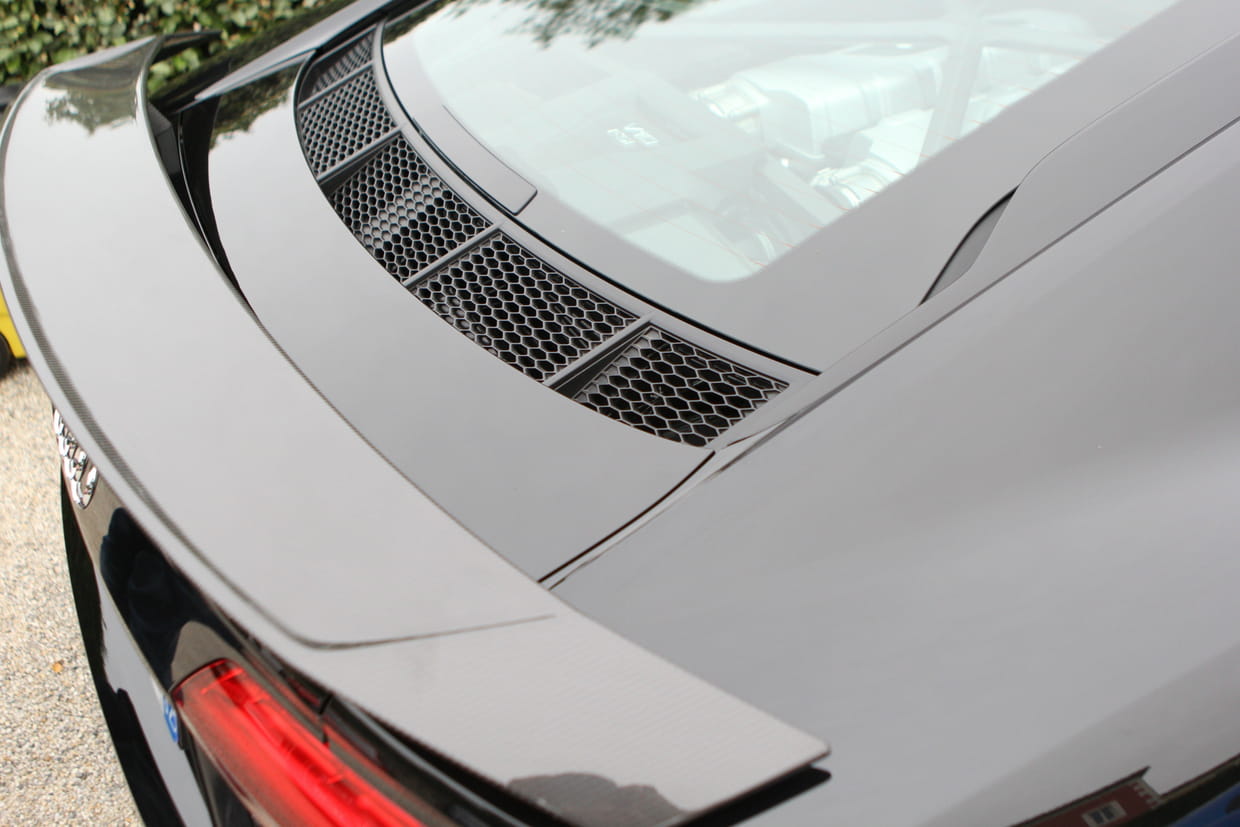 La R8 V10 Plus se dote également d’un aileron arrière en carbone pour rendre l’arrière très anguleux encore plus agressif.