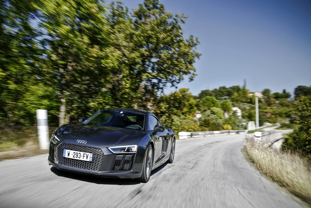 Sur route sinueuse et vallonnée, la R8 se montre assez joueuse mais conserve un équilibre très rassurant, bien aidé par les aides à la conduite embarquées. La puissance est parfaitement répartie, la R8 n'est pas du tout sous-vireuse et permet au conducteur de prendre confiance à son volant. De quoi avaler les courbes à vitesse grand V, rassuré aussi par la répartition du couple.
