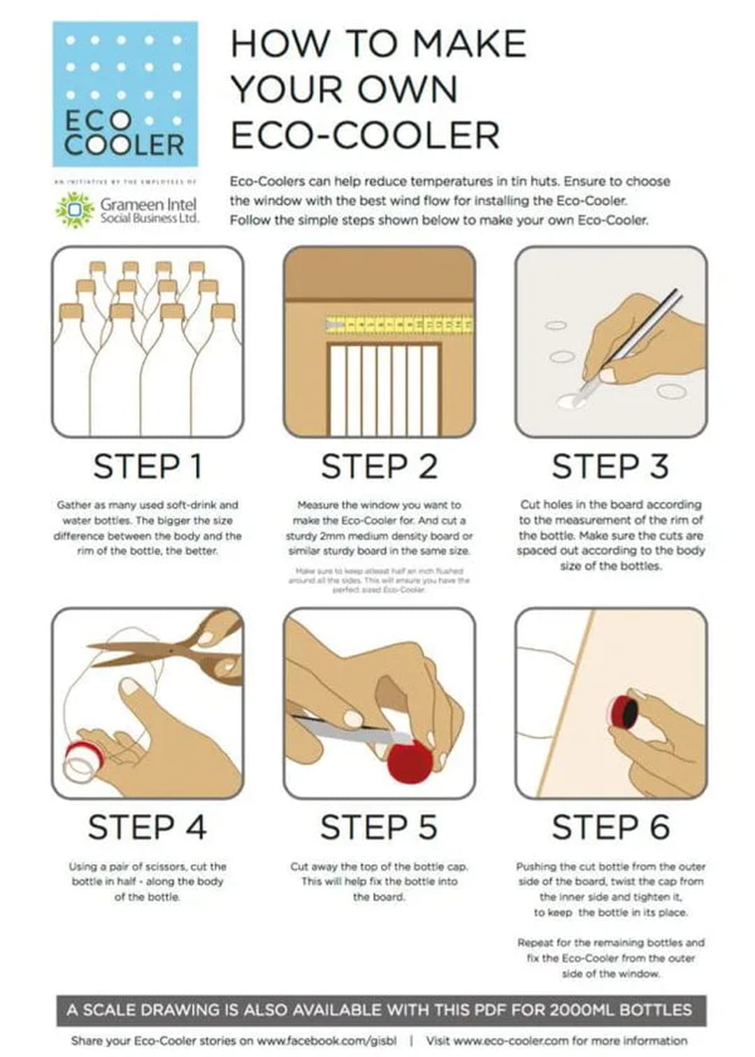 Son invention repose sur un principe simple mais ingénieux : des bouteilles en plastique recyclées sont réutilisées. Pour fabriquer votre Eco-Cooler, rien de plus facile :