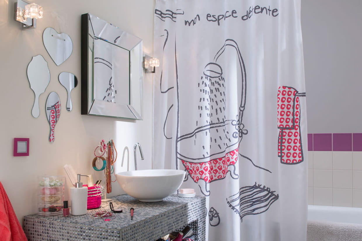 - Prix : 79 € : la vasque, 75 € : le miroir, 17,95 € : le rideau de douche, 19,99 € lot de 3 miroirs adhésifs.