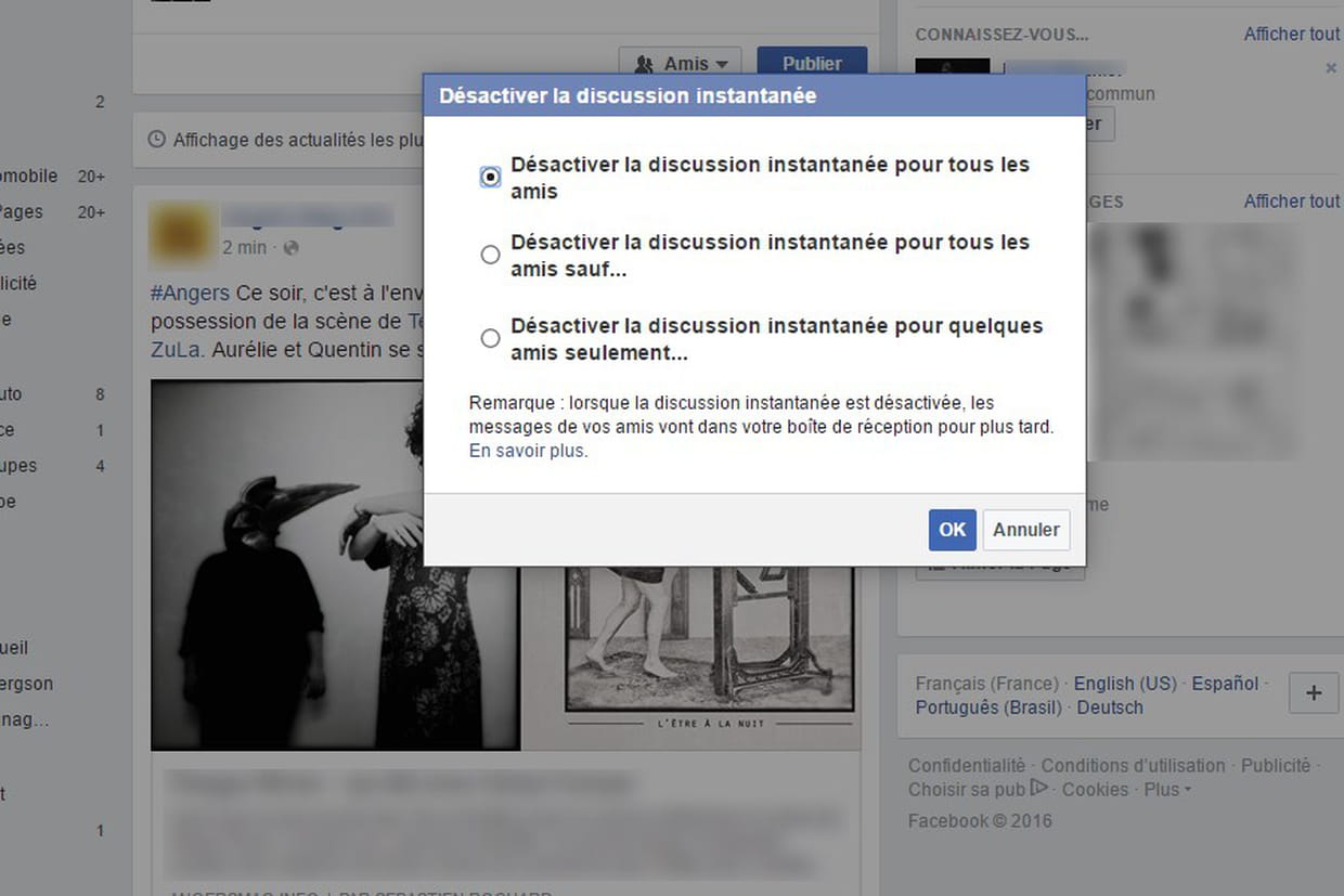 Pour cela, après vous être connecté à votre compte Facebook, cliquez sur l'icône Options en forme de roue dentée tout en bas de la colonne de droite. Cliquez ensuite sur Désactiver la messagerie instantanée et choisissez si vous le faites pour tous vos amis ou pour seulement certains amis. Cliquez sur OK pour valider.