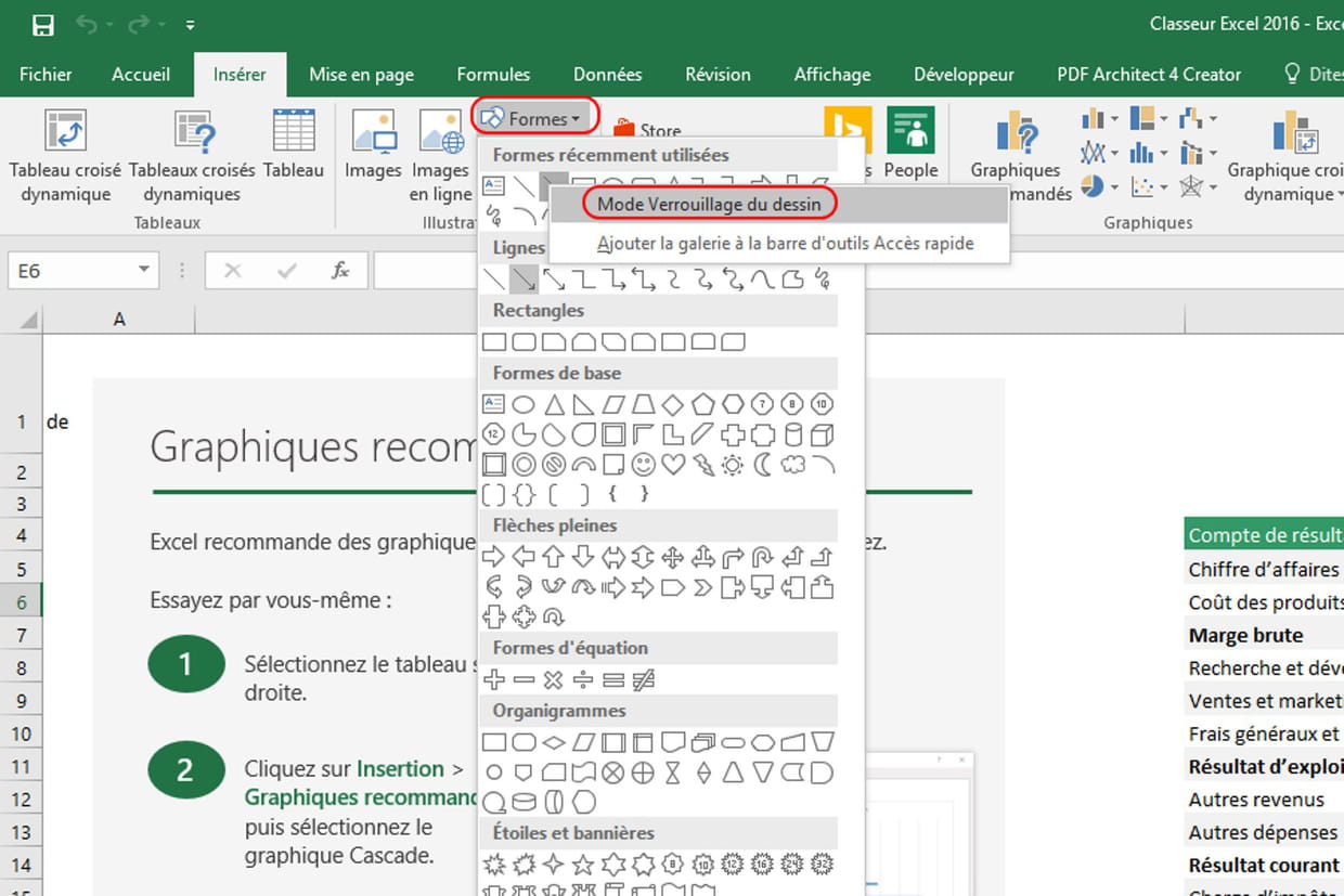 Pour cela, dans l'onglet Insérer du ruban, cliquez sur Formes puis cliquez avec le bouton droit de la souris sur la forme que vous souhaitez insérer et choisissez Mode Verrouillage du dessin. Dessinez à la souris sur votre feuille de calcul le rectangle qui contiendra cette forme et répétez l'opération autant de fois que désiré. Appuyez sur la touche Echap du clavier pour revenir à un mode de saisie normal.