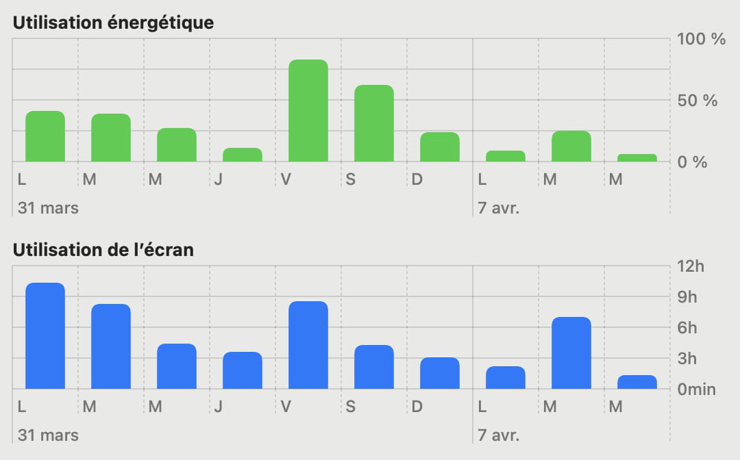 Relevons par exemple les 10h30 d'utilisation du MacBook au cours du lundi 31 mars, où la consommation n'a pas atteint les 40% de batterie. Un résultat impressionnant qui illustre l'endurance de l'ordinateur d'Apple.