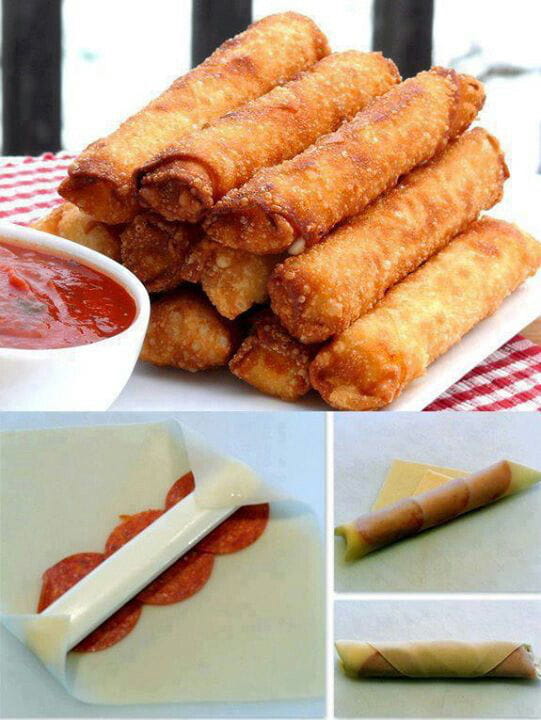 2. La pizza roulée à la mozzarella : prenez de la pâte de riz (à acheter dans les épiceries asiatiques), posez sur chaque feuille une rangée de tranches de pepperoni (salami épicé), puis un morceau de mozzarella découpé en rectangle. Roulez la pâte sur elle-même en ayant auparavant replié les coins vers l'intérieur. Faites dorer au four 15-20 min à 180°C. A servir chaud accompagné d'une sauce tomate au basilic.