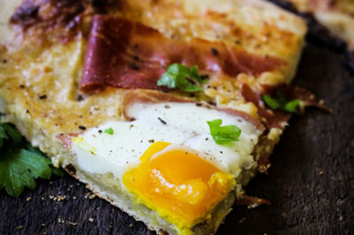 1. La pizza carbonara : du prosciutto (jambon cru italien), voire de la pancetta, des copeaux de parmesan, un œuf posé au milieu, un peu d'ail, du poivre noir concassé, de la crème fraîche et de l'oignon... voici les ingrédients à poser délicatement sur une fine pâte à pizza faite maison. C'est simple et c'est bon.